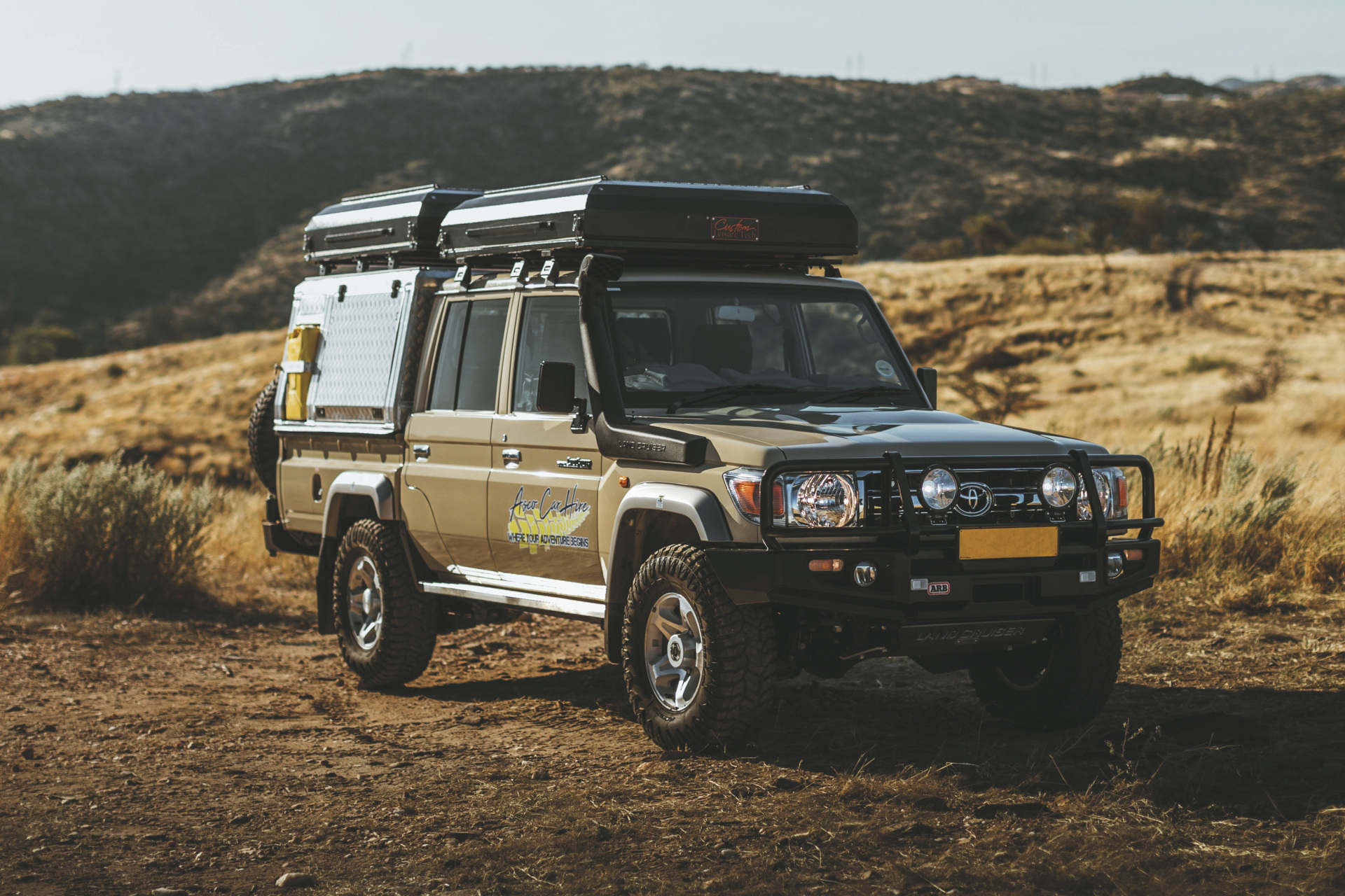 Der besonders zuverlässige Toyota Landcruiser verfügt über zwei große Hartschalen-Dachzelte sowie einen 200 l Treibstofftank für große Reichweite. Ein robuster 4x4-Camper für 3-4 Personen.