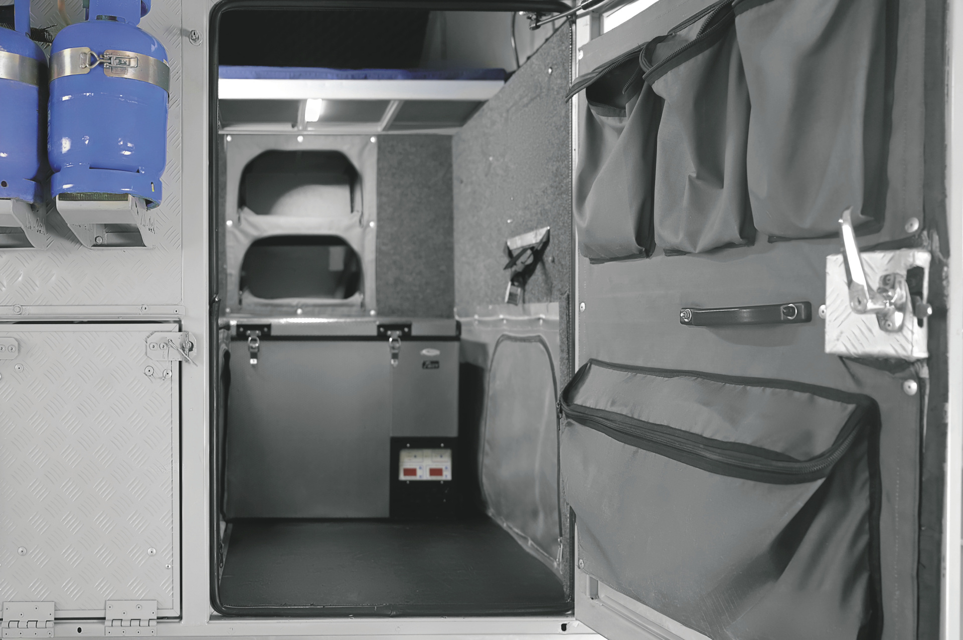 Das Modell besitzt eine größere Fahrerkabine und eine Camping-Kabine mit Hecktür, durch die man zum Bett im aufgeklappten Dach gelangt. Für max. 2 Personen.