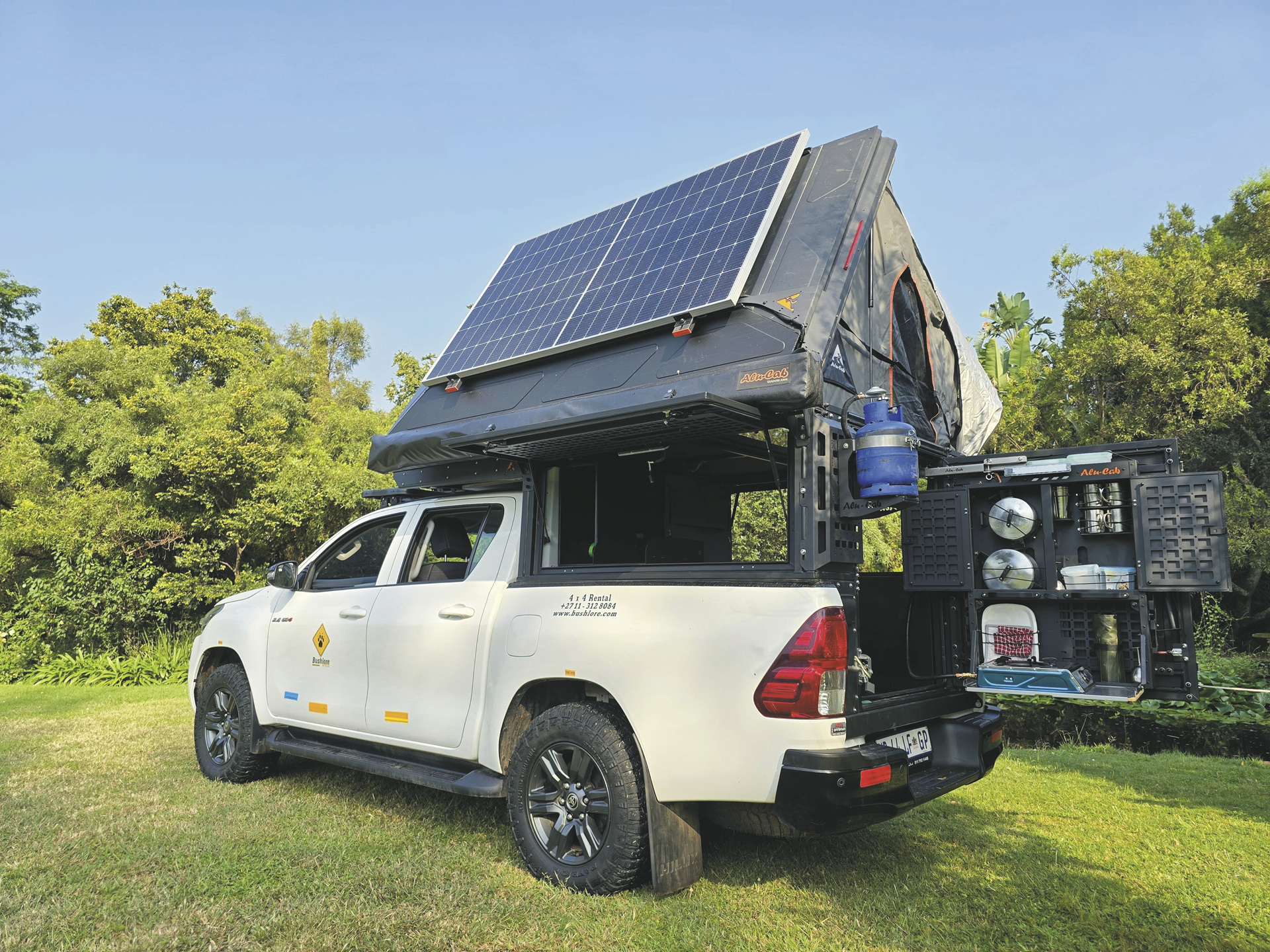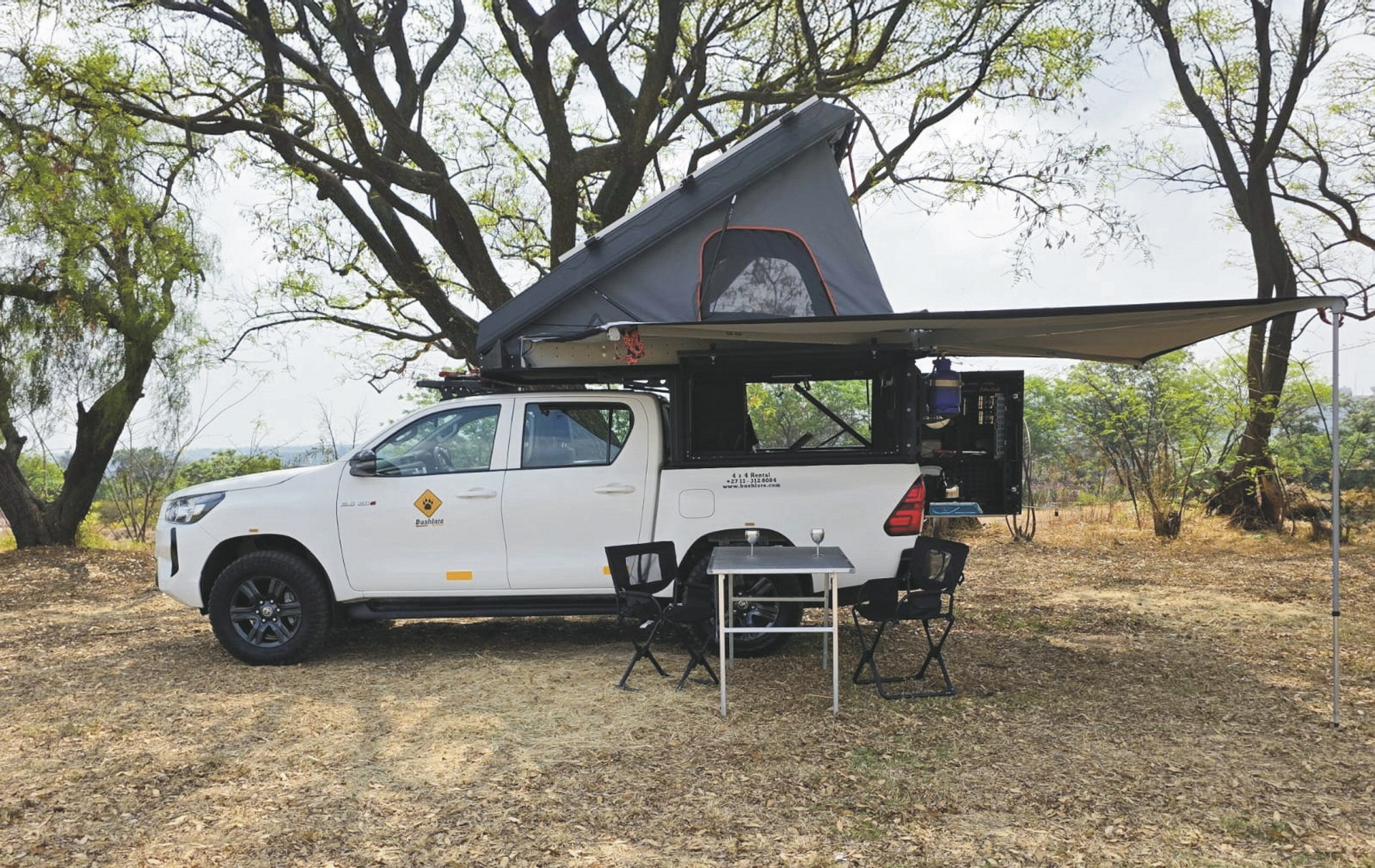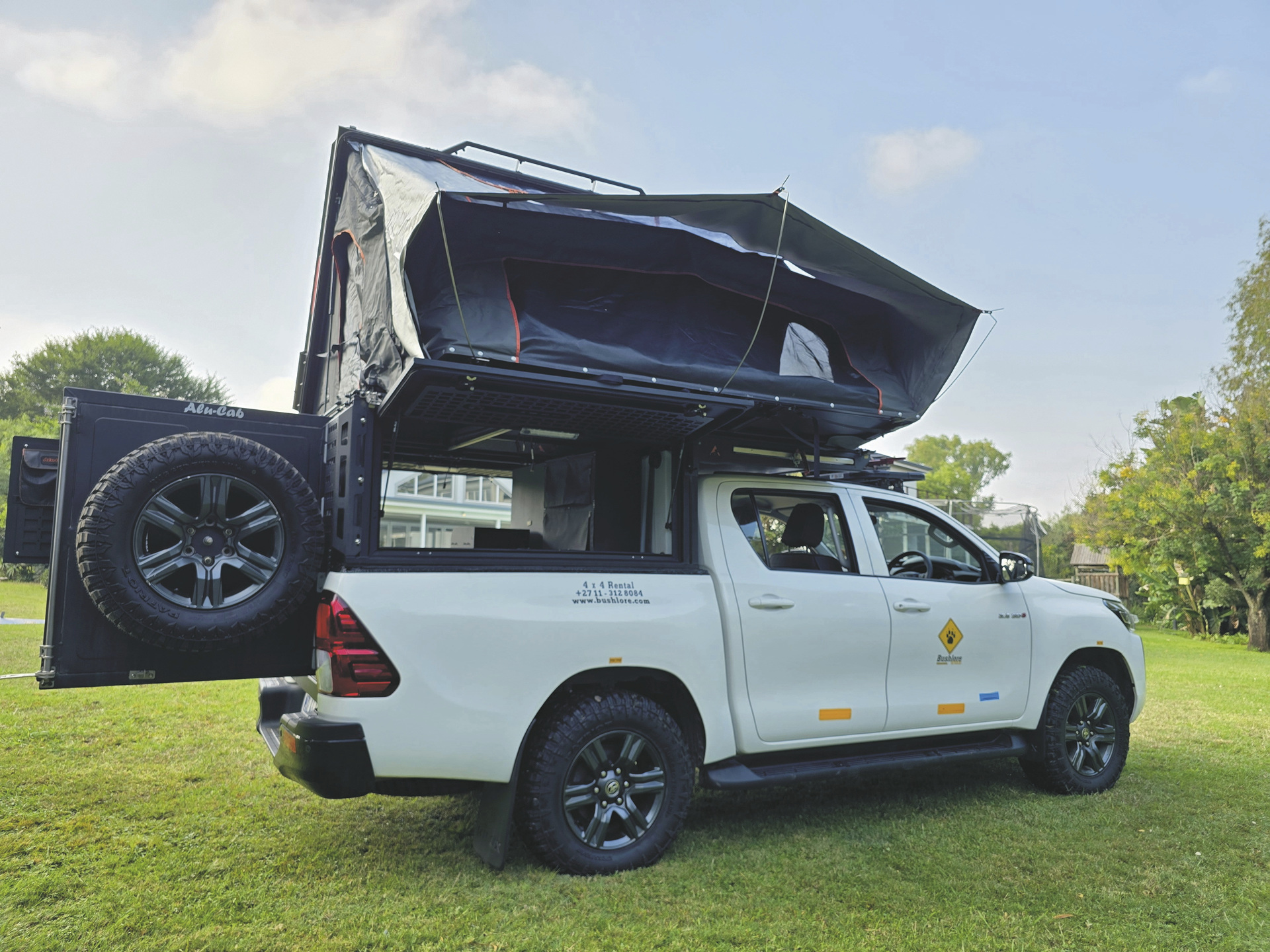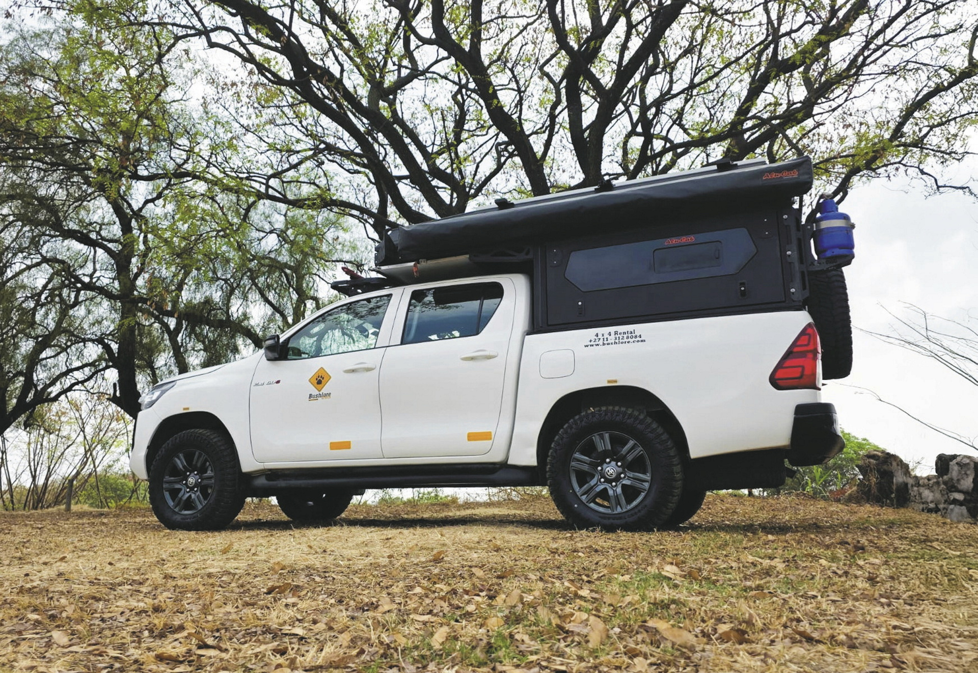 Den beliebten Toyota Hilux Bushcamper gibt es auch als günstigere Variante für nur zwei Personen. Basisfahrzeug ist ein ebenfalls ein Toyota Hilux Double Cab. Die abschließbare Campingkabine verfügt über eine Hecktür, durch die der Zugang zum Doppelbett im Hubdach erfolgt.