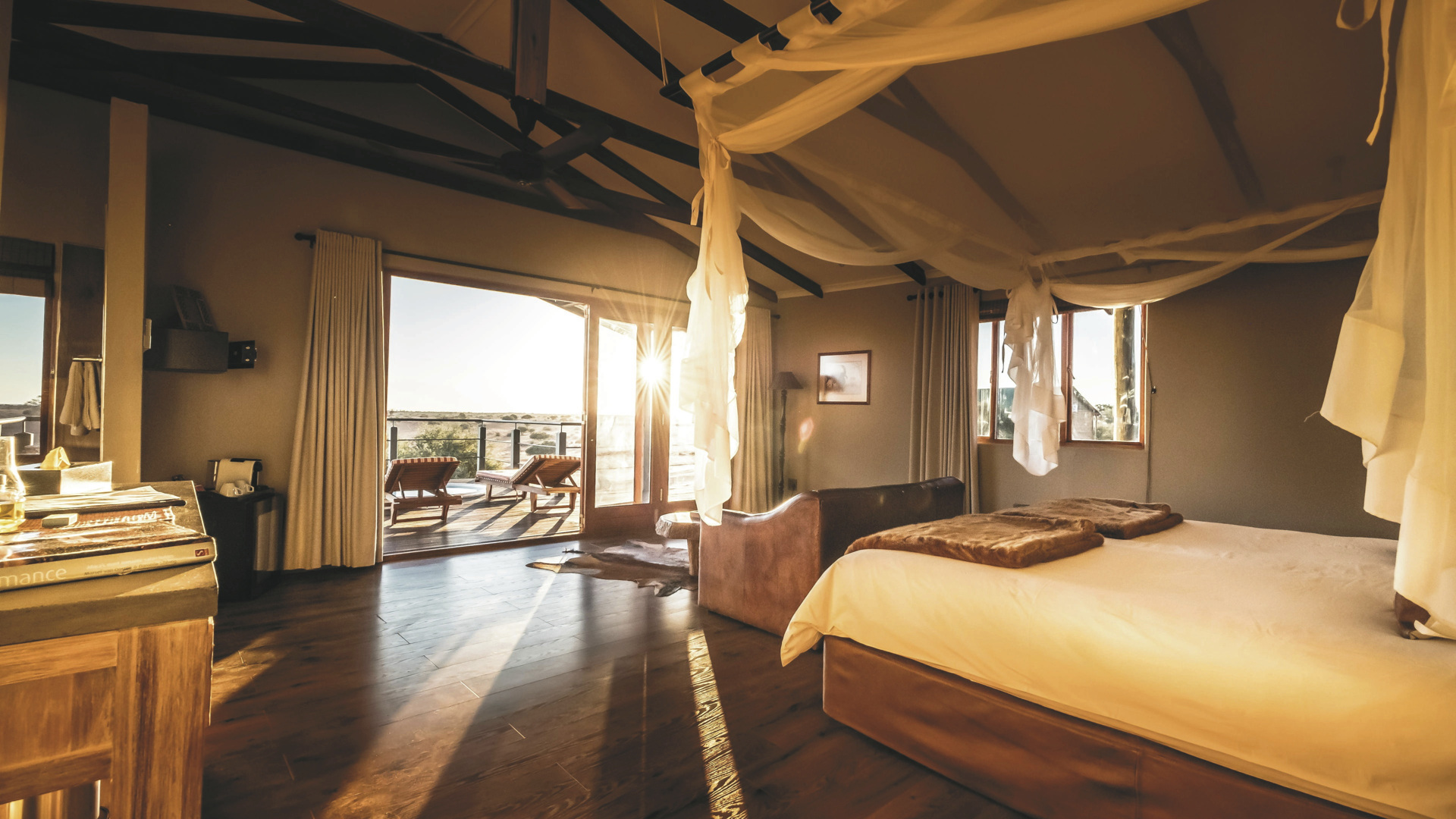 Die 4 großzügigen Dune Chalets mit atemberaubender Aussicht in die Kalahari liegen oben auf einer Dünen, ebenso die 2 Exclusive Chalets. Diese haben jedoch zusätzlich einen privaten Plunge Pool. Die 8 Savannah Chalets befinden sich im Tal zwischen den Dünen, 2 davon sind für Familien geeignet. Im Haupthaus befinden sich 6 kleinere Standardzimmer im afrikanischen Kolonialstil. Alle Zimmer und Chalets mit eigenem Bad, Klimaanlage, Ventilator, Fön, Moskitonetz, Safe, Minibar/Kühlschrank, Tee-/Kaffeezubereiter und Terrasse oder Balkon.