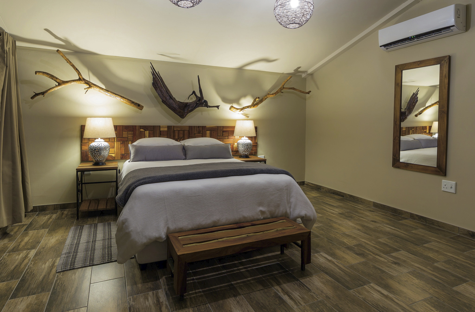 Schöne, weitläufige Anlage mit vielen Annehmlichkeiten. Im zentralen Bereich befindet sich das Restaurant mit großer Terrasse mit schattenspendenden Kameldornbäumen und Blick auf die beleuchtete Wasserstelle sowie eine Bar mit erhöhter Aussichtsterrasse, der Souvenirshop, eine Feuerstelle sowie ein großer Pool. Kostenloses WLAN finden Sie im kompletten Hauptbereich. Das abwechslungsreiche Grillbuffet unter dem Sternenhimmel am Abend sucht seines Gleichen in ganz Namibia. Optionale Aktivitäten: geführte Wanderungen, Panoramafahrten, Rundflüge mit dem Kleinflugzeug oder Hubschrauber; private Wüsten-Dinner, Heißluftballonfahrten sowie Ausflüge zum Sesriem Canyon, dem Deadvlei oder Sossusvlei.