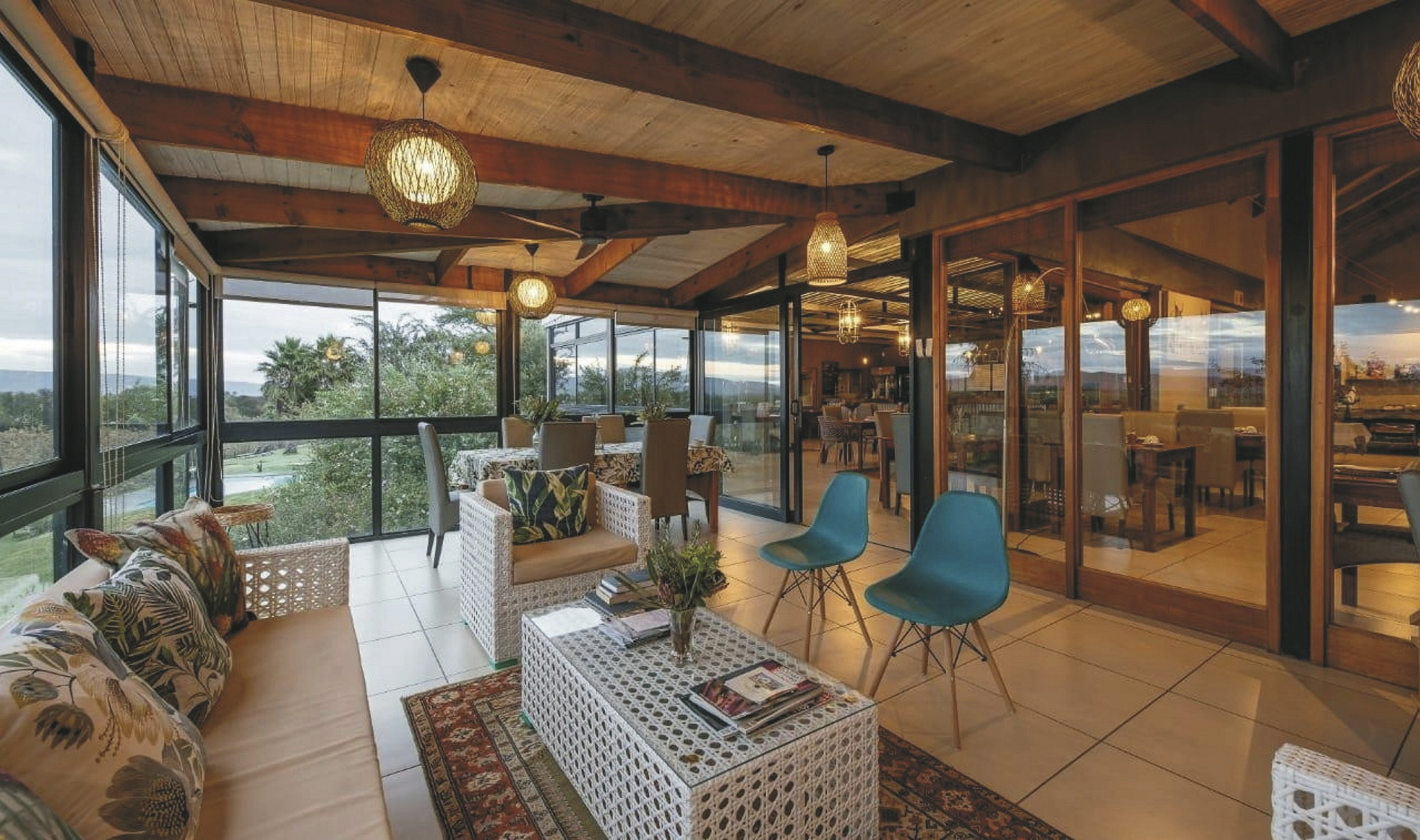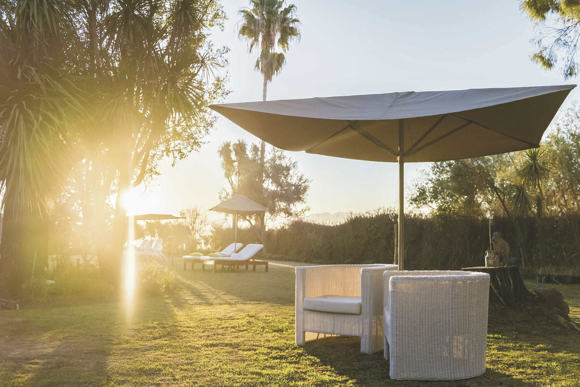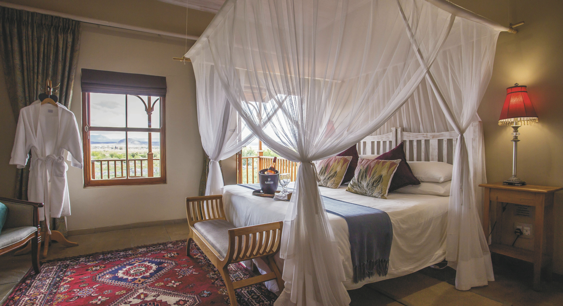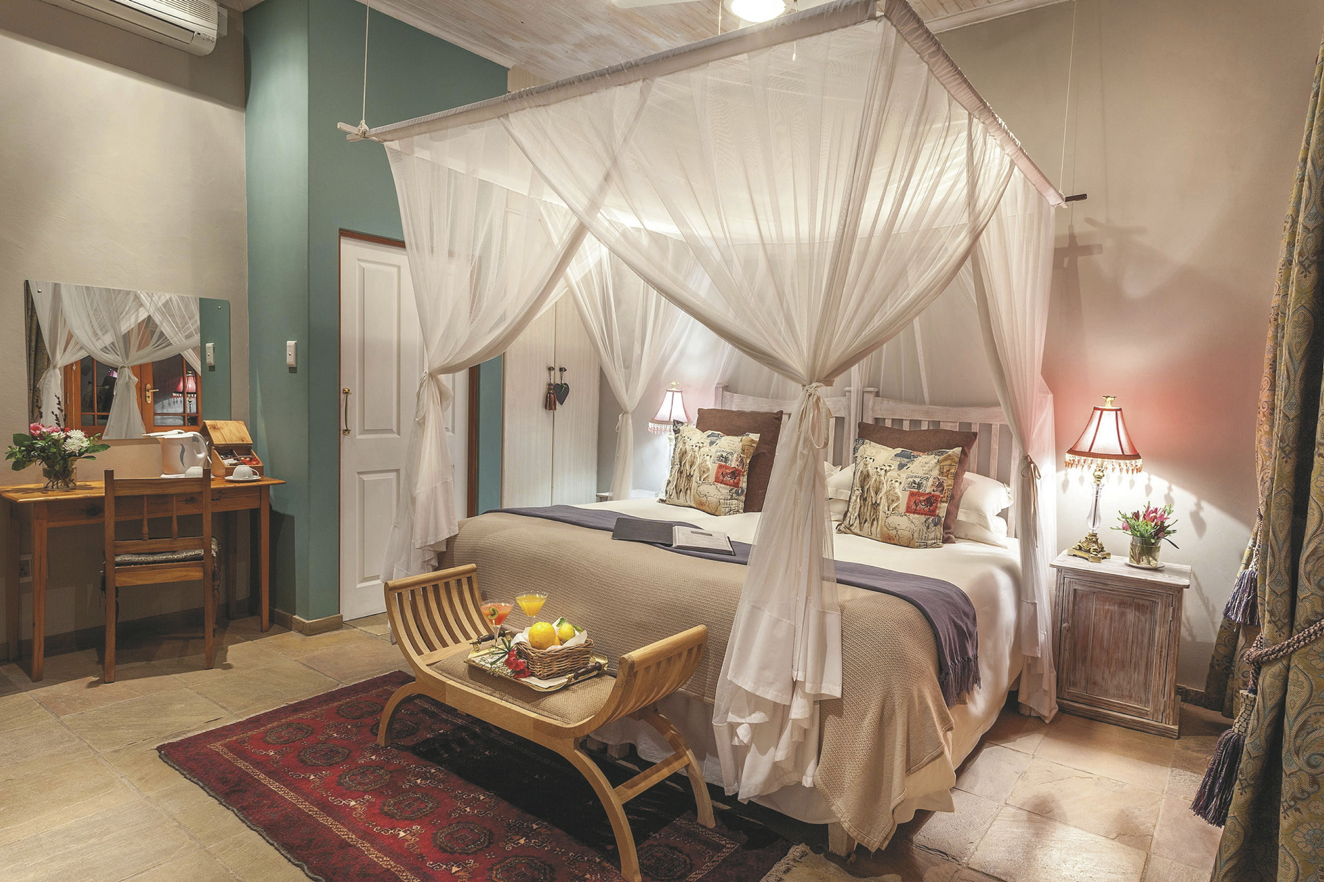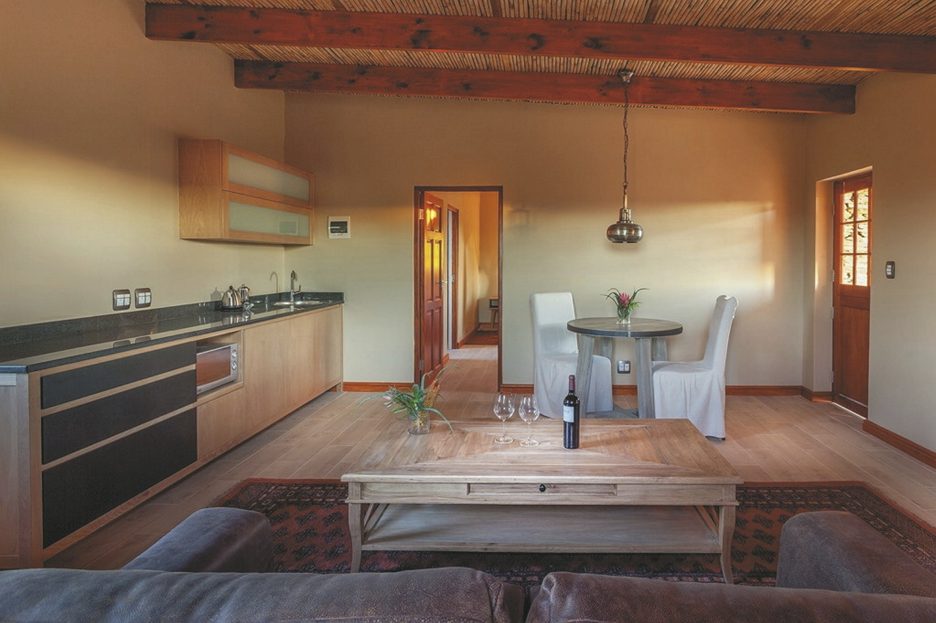 Die 24 individuell eingerichteten Zimmer versprühen einen charmanten Farmcharakter. Sie befinden sich in verschiedenen Gebäuden und unterscheiden sich durch den Ausblick und die Größe voneinander. Jedes hat ein eigenes, teils offenes Badezimmer, außerdem einen Fön, Klimaanlage, Safe, Kühlschrank, WLAN, Tee-/Kaffeezubereiter, TV, Moskitonetz; einige Zimmer haben einen Kamin.