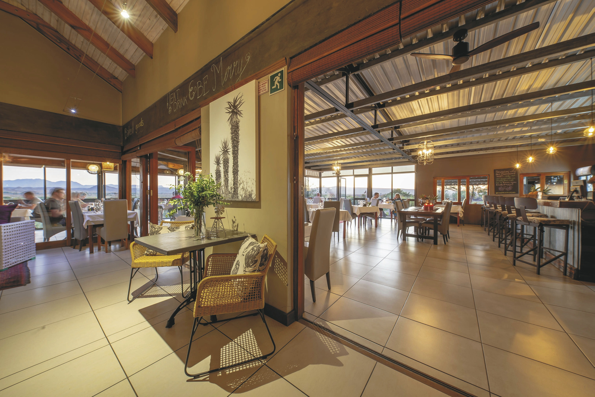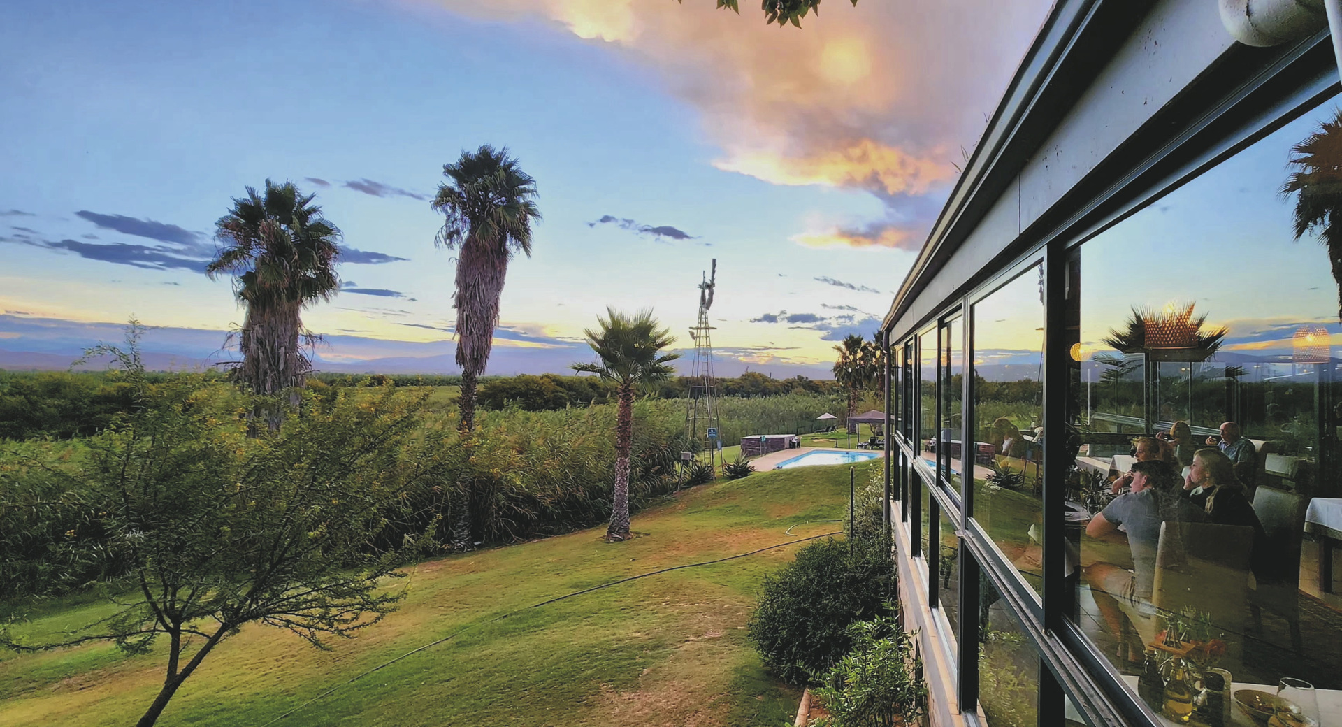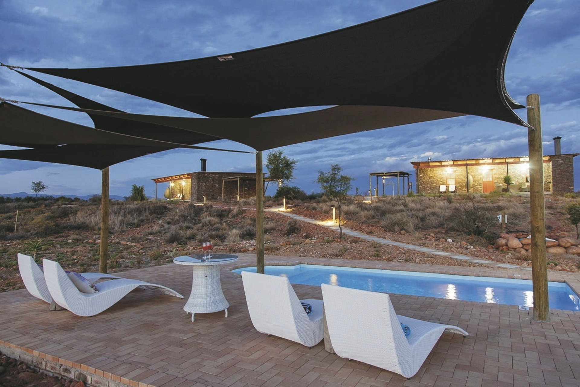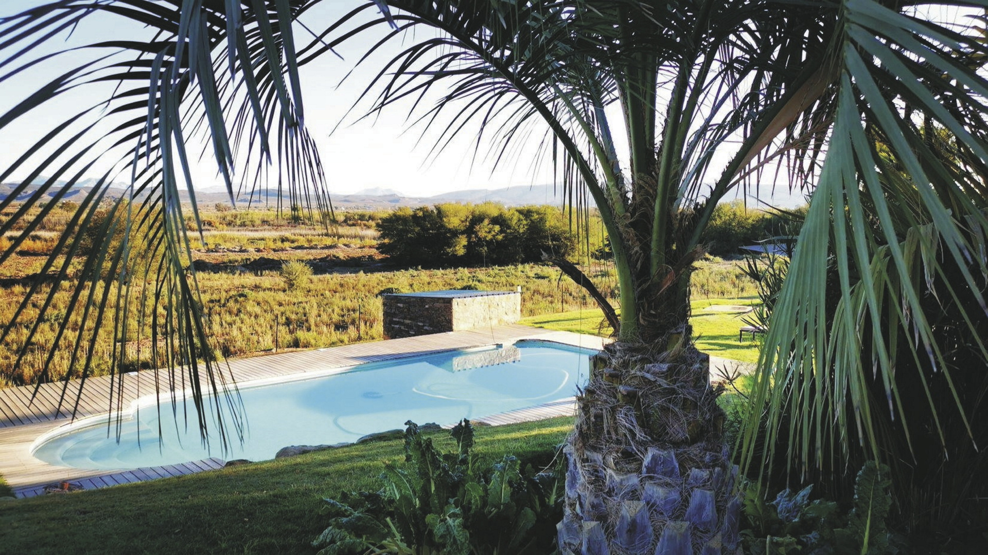 Das 150 Jahre alte Farmhaus wurde liebevoll in einen Gästebetrieb umgewandelt und um zahlreiche Nebengebäude, in denen die meisten Zimmer untergebracht sind, erweitert. Im Restaurant erwartet Sie einzigartige Karoo-Küche mit vielen Produkten aus eigenem Anbau bzw. eigener Zucht. Die urige Bar, die gemütliche Lounge oder aber die Feuerstelle unter den Sternen Afrikas, das sind die Treffpunkte der Gäste am Abend. Für entspannte Stunden finden Sie am Salzwasserpool oder im Spa ein gutes Plätzchen. In der hauseigenen Boutique können Sie, neben klassischen Souvenirs, vor allem Produkte und Lederwaren vom Strauß direkt vom Erzeuger erwerben. Kostenloses WLAN finden Sie im Haupthaus. Wer die Umgebung gerne aktiv erkunden möchte, kann sich ein Mountain-Bike oder ein Kanu ausleihen oder auf einem der vielen ausgewiesenen Wanderwegen zu Fuß die Region erwandern. Optionale Aktivität: Erdmännchen-Safari.