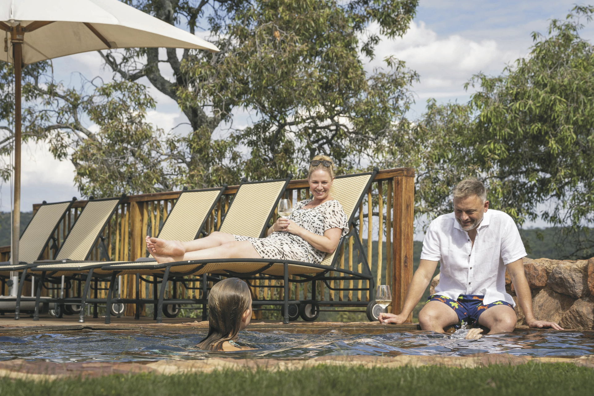 Der zentrale Bereich beherbergt die Lounge, wo an kühlen Abenden ein gemütliches Kaminfeuer brennt; die Bar und das Restaurant sowie eine große Terrasse mit reichlich Sitzmöglichkeiten um das nahe Wasserloch zu beobachten oder einfach zu entspannen. Vom Pool und der Sonnenterrasse haben Sie ebenfalls Blick auf das gut besuchte Wasserloch und über die Graslandschaft. Am Abend wird das Essen nach Möglichkeit in der Boma oder auf der Terrasse unter dem Sternenhimmel serviert. Eingeschlossene Aktivitäten: Pirschfahrten, Buschwanderungen, Kinderaktivitäten.