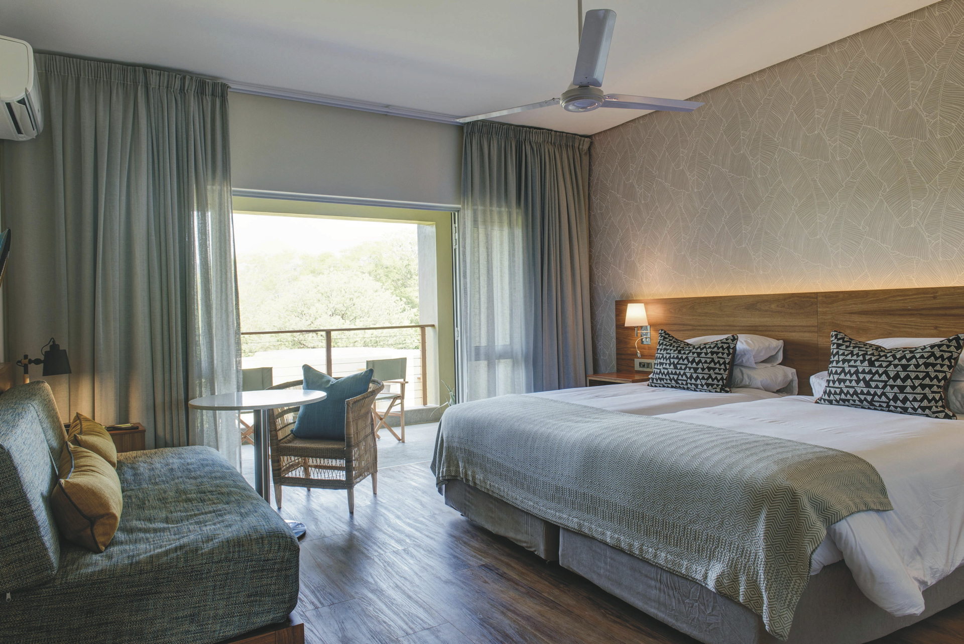 Es gibt insgesamt 70 Zimmer und 4 Suiten, die sich auf verschiedene Gebäude im Garten verteilen. Die kleineren Standardzimmer sind ebenerdig im ältesten Gebäudeteil untergebracht und blicken entweder in den Garten oder den Innenhof. Die Superior Zimmer überblicken den See und die Lebombo Berge. Die Gartenzimmer haben eine kleine Terrasse und einen Loungebereich. Die Bergblickzimmer sind im neusten Gebäudetrakt untergebracht und bieten mit einer Schlafcouch einem zusätzlichen Kind Platz. Die 4 Suiten sind äußerst geräumig und bieten eine tolle Aussicht auf den Garten, den See und die Lebombo Berge, jede verfügt zusätzlich über eine großzügige Lounge und einige über eine Innen- und Außendusche. Alle Zimmer und Suiten verfügen über ein eigenes Bad, TV, Telefon, Klimaanlage, Ventilator, Fön, Safe, Kühlschrank, Tee-/Kaffeezubereiter und kostenloses WLAN.