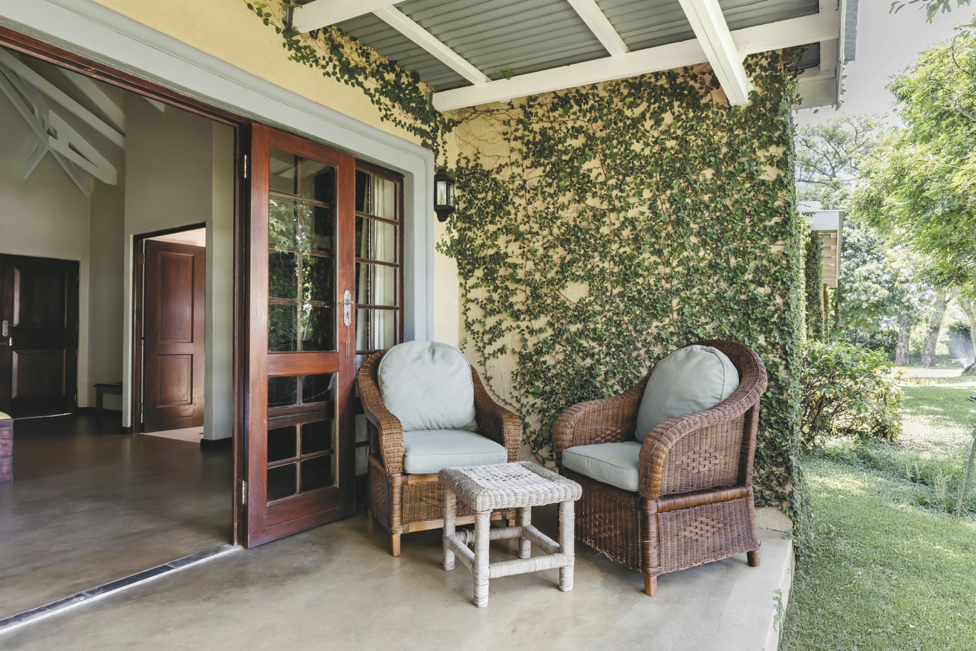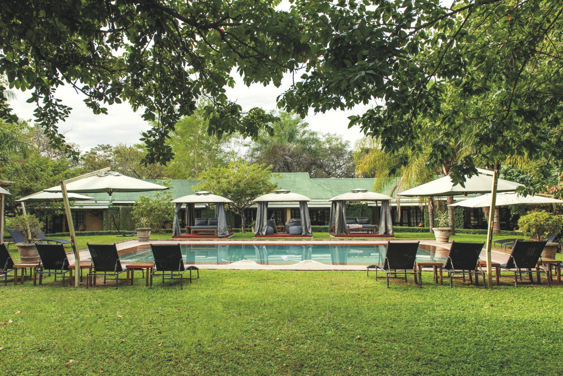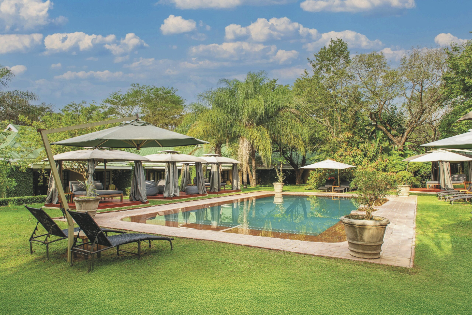 Die 31 großzügigen Zimmer liegen im weitläufigen Garten verstreut. Jedes Zimmer verfügt über ein Bad mit Innen- und Außendusche, außerdem Klimaanlage/Heizung, TV, Safe, Fön, Ventilator, Kühlschrank, Kaffee-/Teezubereiter und eine Terrasse. Außerdem gibt es Familienzimmer mit 3 Betten, einer Schlafcouch und zusätzlicher Badewanne, jedoch ohne Außendusche.
