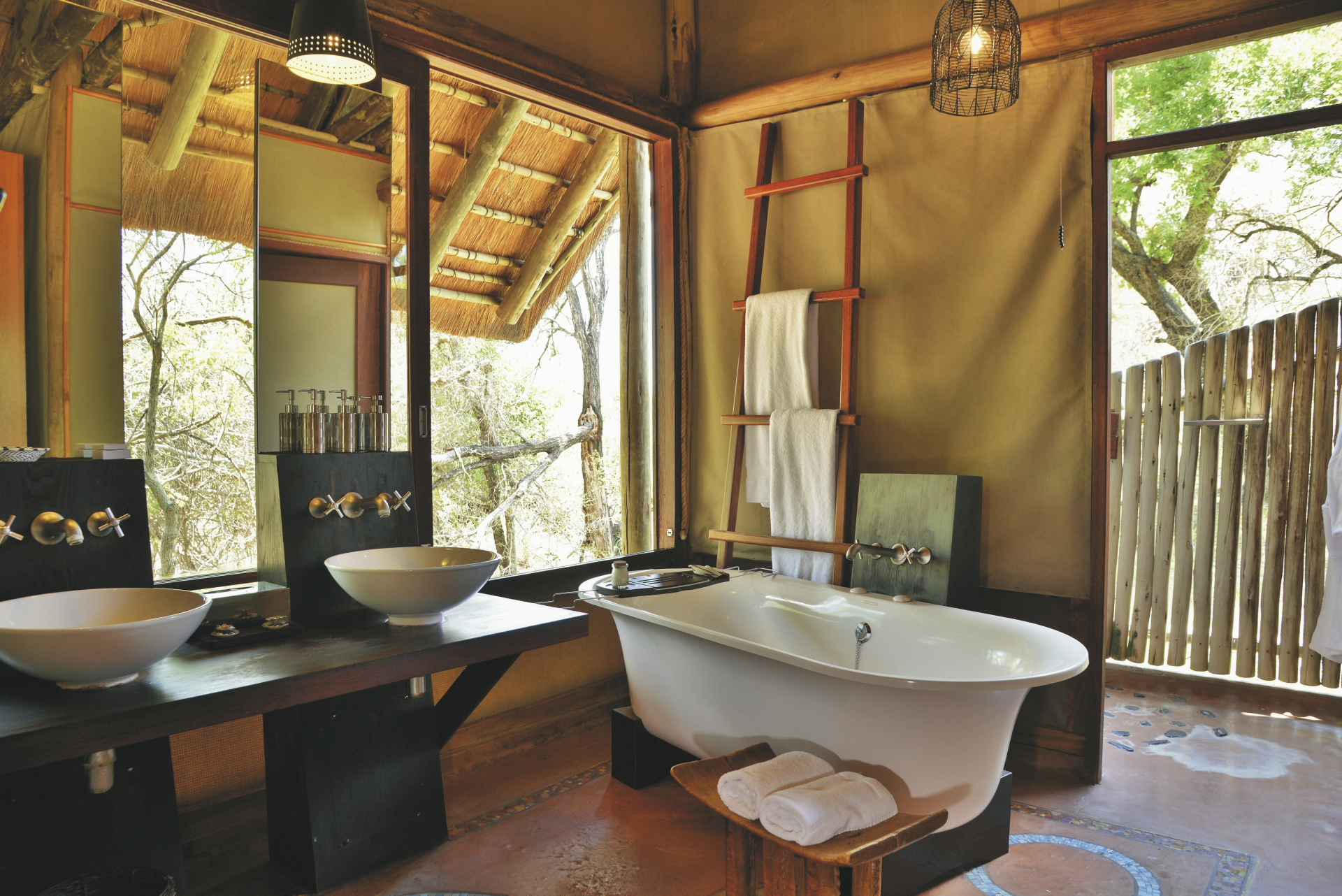 Im offenen Hauptgebäude befindet sich das Speisezimmer mit einer großen Holzveranda, wo überwiegend die Mahlzeiten eingenommen werden, und eine Bar, jeweils mit Blick auf ein Wasserloch im Trockenflussbett. Im Loungebereich brennt am Abend im Kamin ein lauschiges Feuer, hier finden Sie limitiertes WLAN. Unter dem Sternenhimmel sitzt man abends um die Feuerstelle und genießt einen guten Tropfen aus dem wohlsortierten Weinkeller. Ein kleiner Shop, eine Bibliothek und ein Pool mit Sonnenterrasse runden das Serviceangebot ab. Eine Spa-Behandlung kann in der eigenen Suite durchgeführt werden. Eingeschlossene Aktivitäten: Pirschfahrten auf den befestigten Straßen des Krüger Nationalparks und auf den Wegen der eigenen Konzession. Optional kann ein Sleep-Out unter den Sternen Afrikas gebucht werden (ab 4 Personen ohne Extrakosten).
