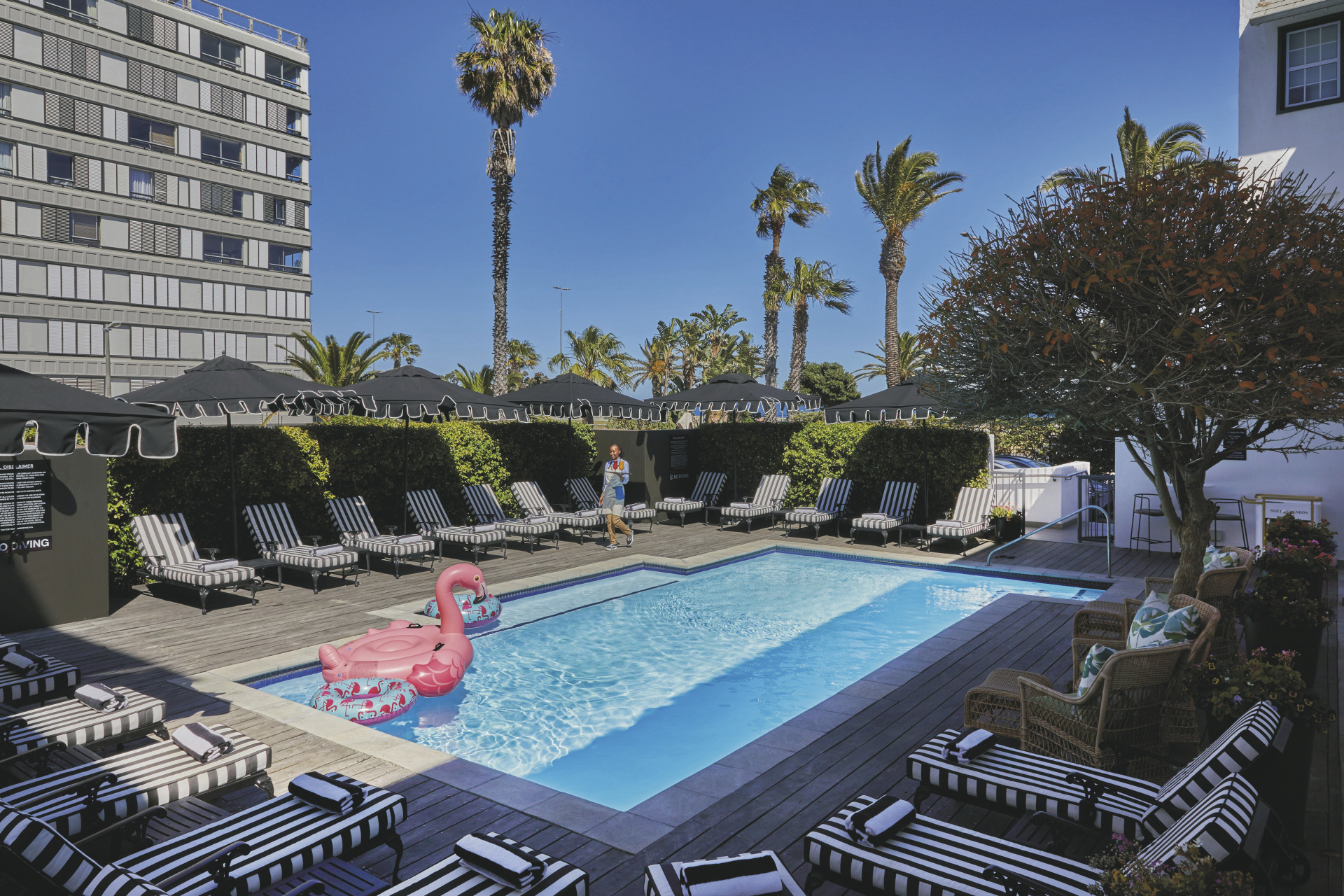 Der hübsch bepflanzte Innenhof lädt auch bei windigem Wetter zum Entspannen ein. Köstliche Spezialitäten werden Ihnen im Shoreditch Restaurant serviert. In Harvey´s Bar findet in unregelmäßigen Abständen sonntags der beliebte Jazz-Brunch statt. Des Weiteren stehen Ihnen ein beheizter Pool mit Sonnenterrasse, eine gemütliche Lounge und der Spa zur Verfügung. Kostenloses WLAN finden Sie nahezu überall im Hotel. Ihren Mietwagen können Sie auf dem hauseigenen, kostenpflichtigen Parkplatz abstellen. Ein kostenloser Shuttle fährt mehrmals täglich zur V&A Waterfront.