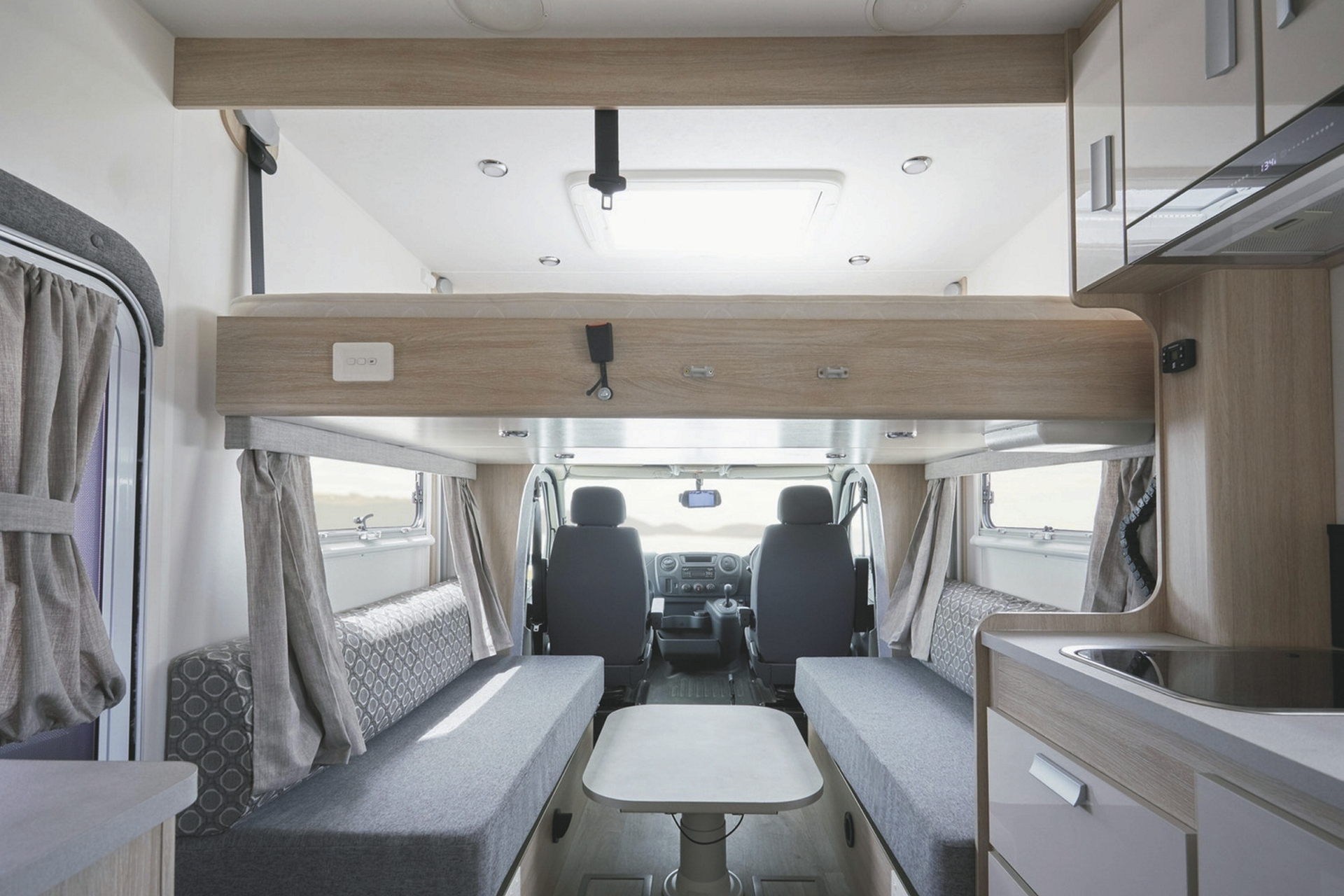 • Elektrisch absenkbares Bett in der Fahrzeugmitte oberhalb der Sitzgruppe 1,97 x 1,45 m