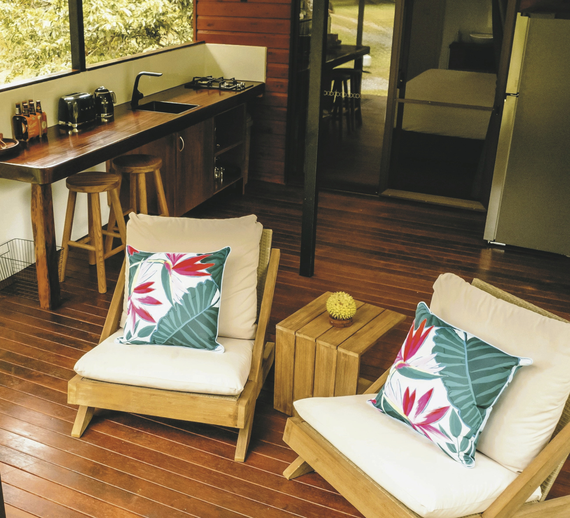 5 freistehende, komfortable Cottages (Bungalows) mit Privatsphäre und Bergblick. Die Einrichtung ist mit einzigartigen Möbelstücken aus Regenwaldholz gestaltet. Alle Bungalows verfügen über ein eigenes Bad mit begehbarer Dusche, eine Kitchenette mit Kühlschrank, Gaskocher und Spüle, Deckenventilator und Klimaanlage sowie eine überdachte Terrasse. Zwei der Bungalows haben zusätzlich zum Kingsize-Doppelbett noch ein zusätzliches Einzelbett und können mit drei Personen belegt werden.
