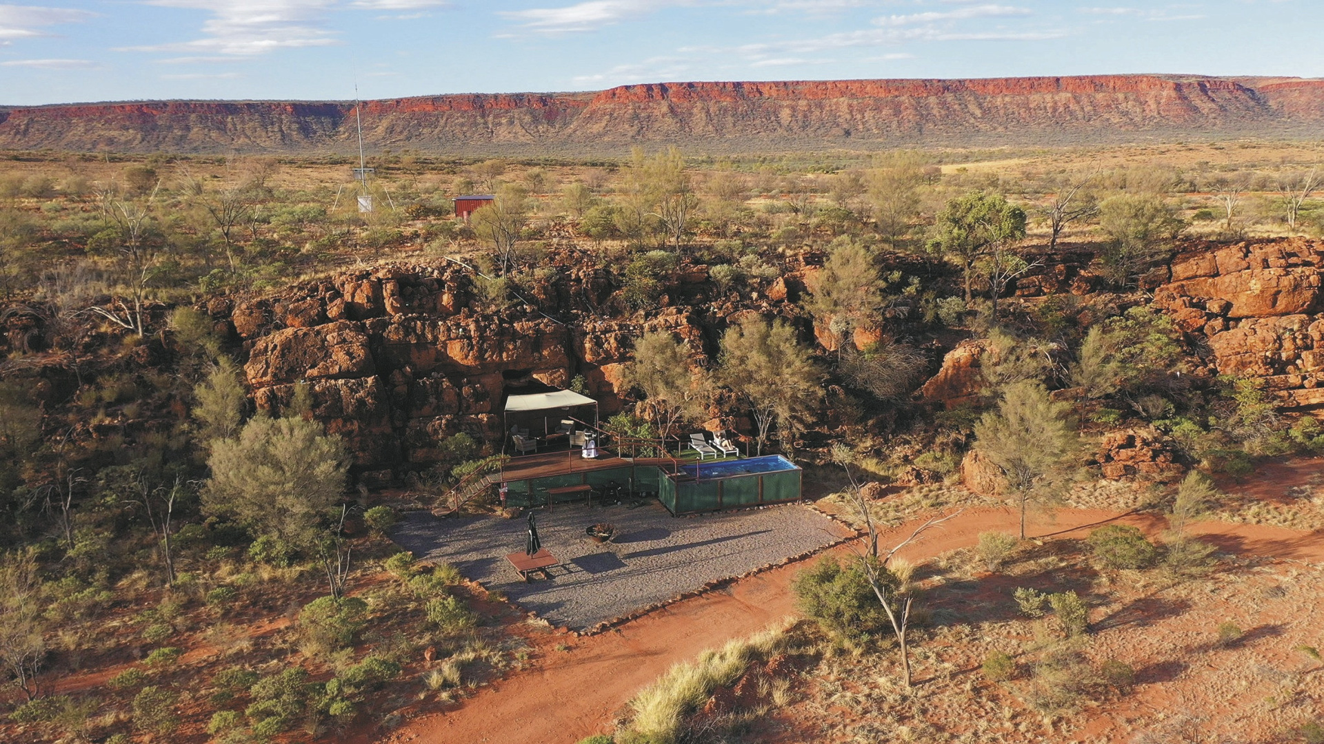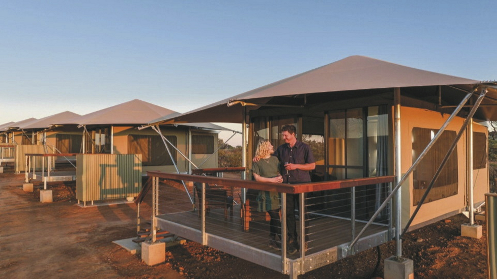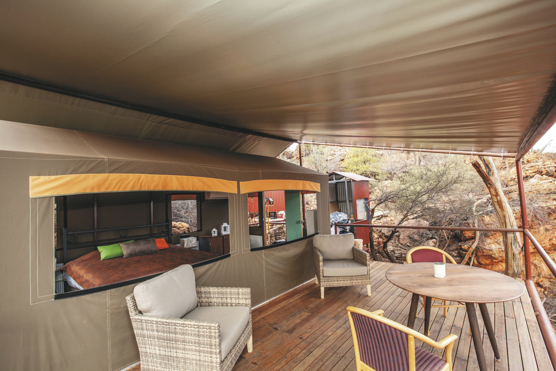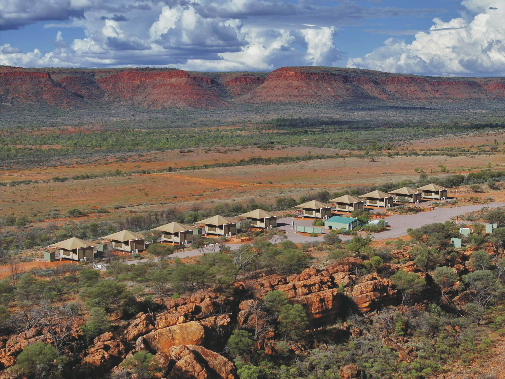 Die Anlage bietet verschiedene Unterkunftsoptionen, darunter die höherwertigen Kategorien Drovers Dream und Dreamtime Escarpment. Drovers Dream umfasst 10 Bungalow-Zelte in ruhiger Lage mit Blick auf die umliegende Landschaft. Zur Ausstattung zählen u.a. eigenes Bad mit Dusche, Queensize-Bett, Klimaanlage sowie eine private Terrasse mit BBQ. Weiterhin gibt es eine gemeinsame Feuerstelle.Die 3 größeren und komfortabler ausgestatteten Dreamtime Escarpment-Zelte liegen erhöht entlang eines Felsrands in abgeschiedener Lage (ca. 7 km von der Rezeption und dem Cafe entfernt; 4WD-Fahrzeug empfohlen) und bieten mehr Privatsphäre, weite Ausblicke sowie gute Luftzirkulation. Sie verfügen u.a. über ein Outdoor-Bad mit Dusche und WC, Kingsize-Bett mit hochwertiger Bettwäsche, Bademäntel und Slipper, Klimaanlage, Heizung, Stromanschluss und Kaffeezubereiter. Ergänzt wird die Ausstattung durch eine private Außenfläche mit Sitzmöglichkeiten und Feuerstelle. Gäste erhalten zusätzlich ein Verpflegungspaket mit BBQ-Dinner und Frühstück zur Selbstzubereitung. Ein Pool exklusive für die maximal 6 Gäste der Dreamtime Escarpment-Zelte steht ebenfalls zur Verfügung.