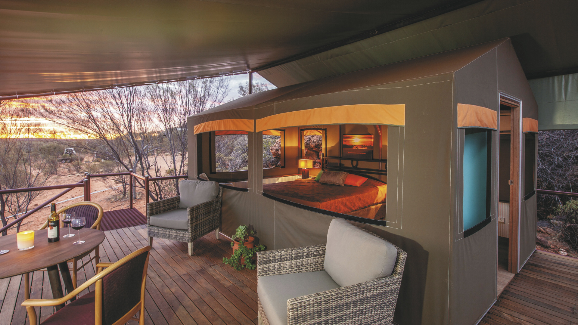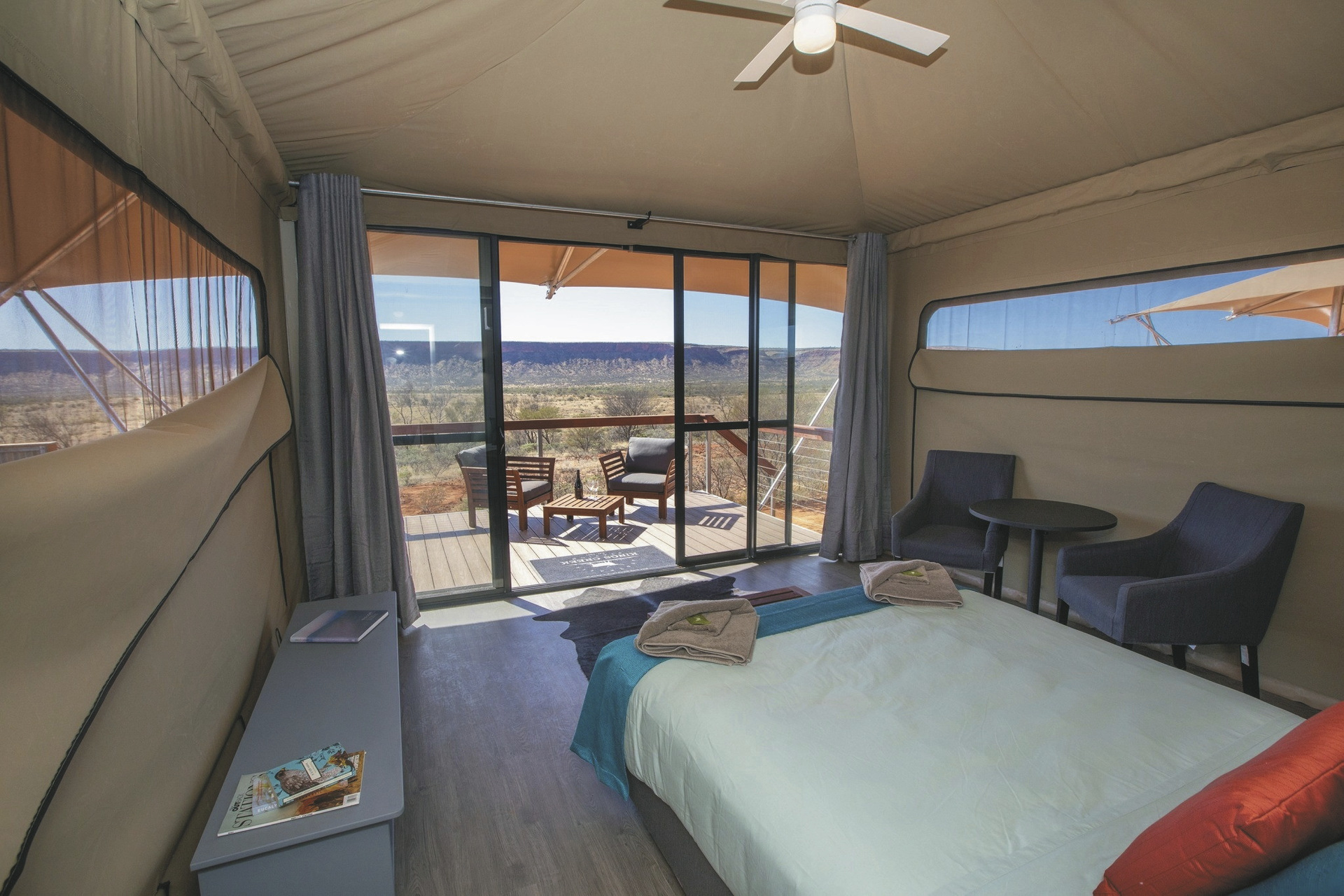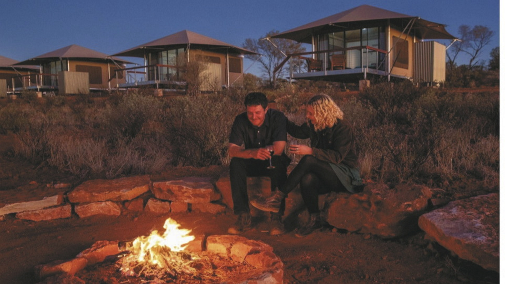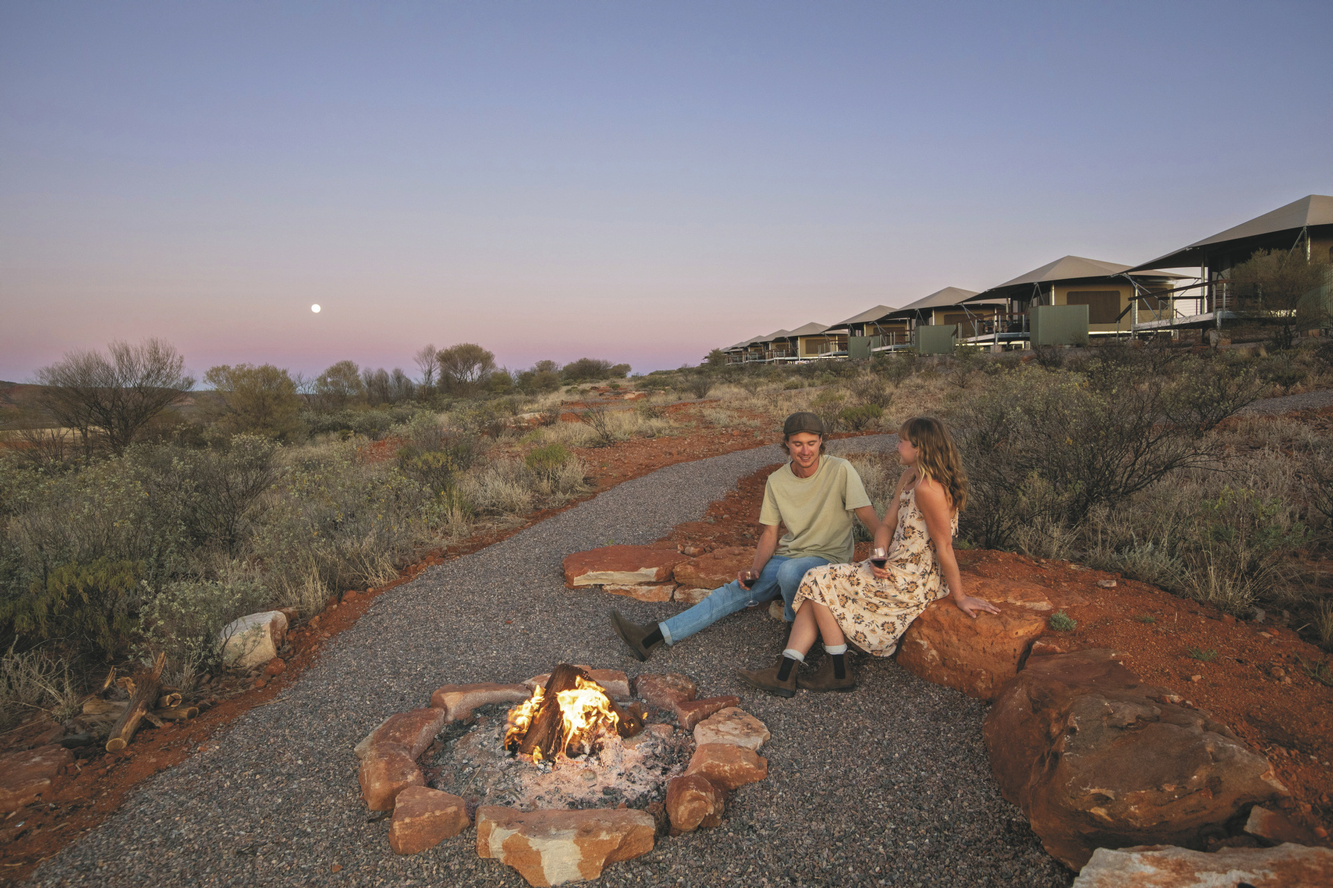 Die Anlage bietet verschiedene Unterkunftsoptionen, darunter die höherwertigen Kategorien Drovers Dream und Dreamtime Escarpment. Drovers Dream umfasst 10 Bungalow-Zelte in ruhiger Lage mit Blick auf die umliegende Landschaft. Zur Ausstattung zählen u.a. eigenes Bad mit Dusche, Queensize-Bett, Klimaanlage sowie eine private Terrasse mit BBQ. Weiterhin gibt es eine gemeinsame Feuerstelle.Die 3 größeren und komfortabler ausgestatteten Dreamtime Escarpment-Zelte liegen erhöht entlang eines Felsrands in abgeschiedener Lage (ca. 7 km von der Rezeption und dem Cafe entfernt; 4WD-Fahrzeug empfohlen) und bieten mehr Privatsphäre, weite Ausblicke sowie gute Luftzirkulation. Sie verfügen u.a. über ein Outdoor-Bad mit Dusche und WC, Kingsize-Bett mit hochwertiger Bettwäsche, Bademäntel und Slipper, Klimaanlage, Heizung, Stromanschluss und Kaffeezubereiter. Ergänzt wird die Ausstattung durch eine private Außenfläche mit Sitzmöglichkeiten und Feuerstelle. Gäste erhalten zusätzlich ein Verpflegungspaket mit BBQ-Dinner und Frühstück zur Selbstzubereitung. Ein Pool exklusive für die maximal 6 Gäste der Dreamtime Escarpment-Zelte steht ebenfalls zur Verfügung.