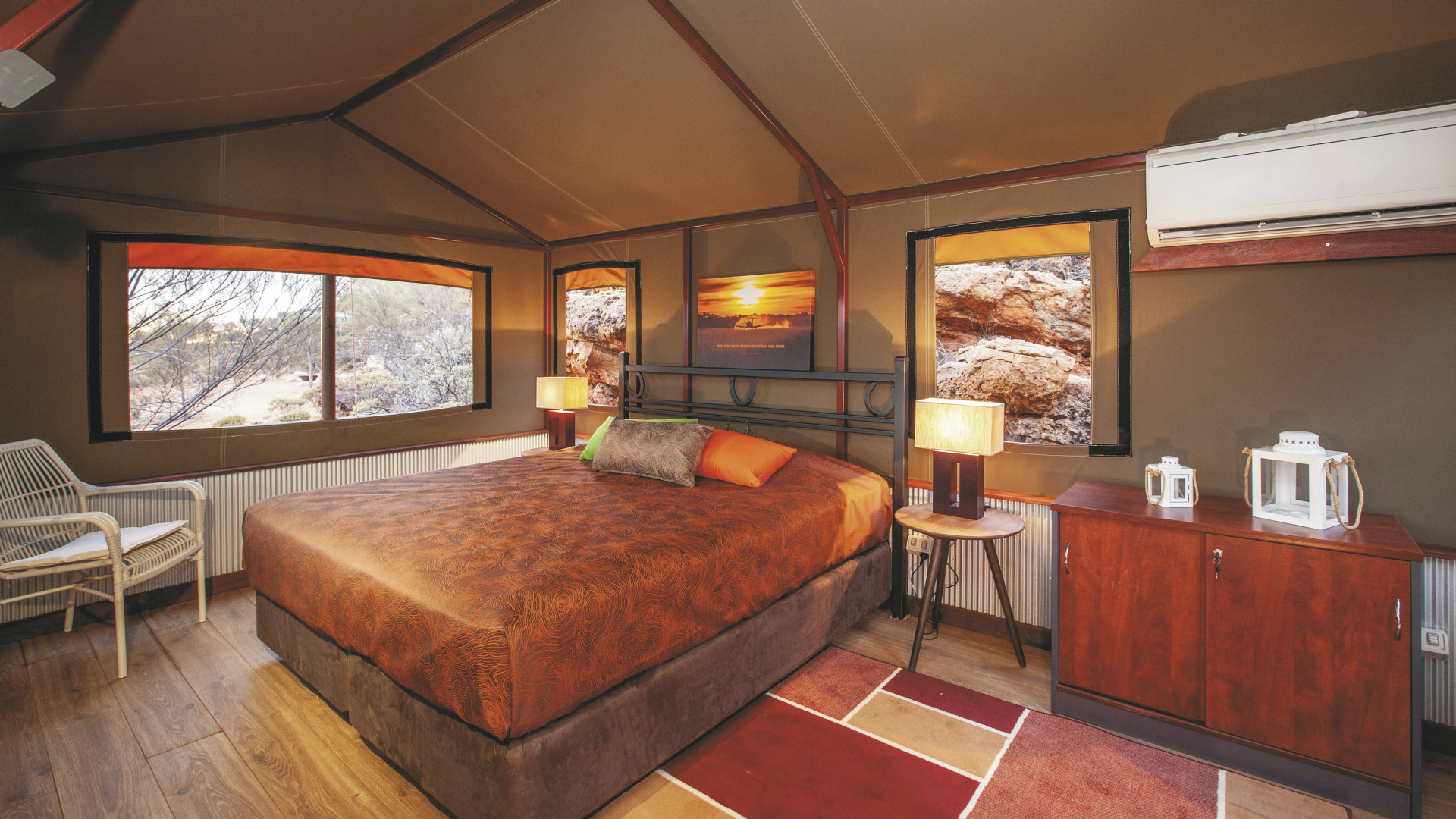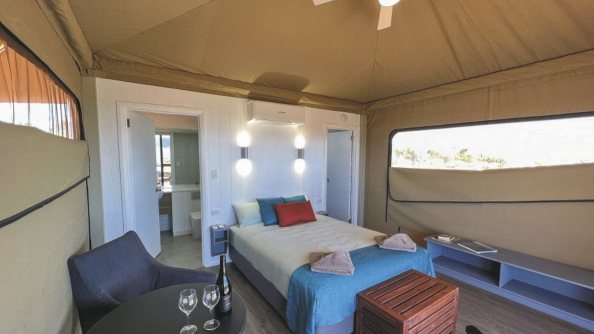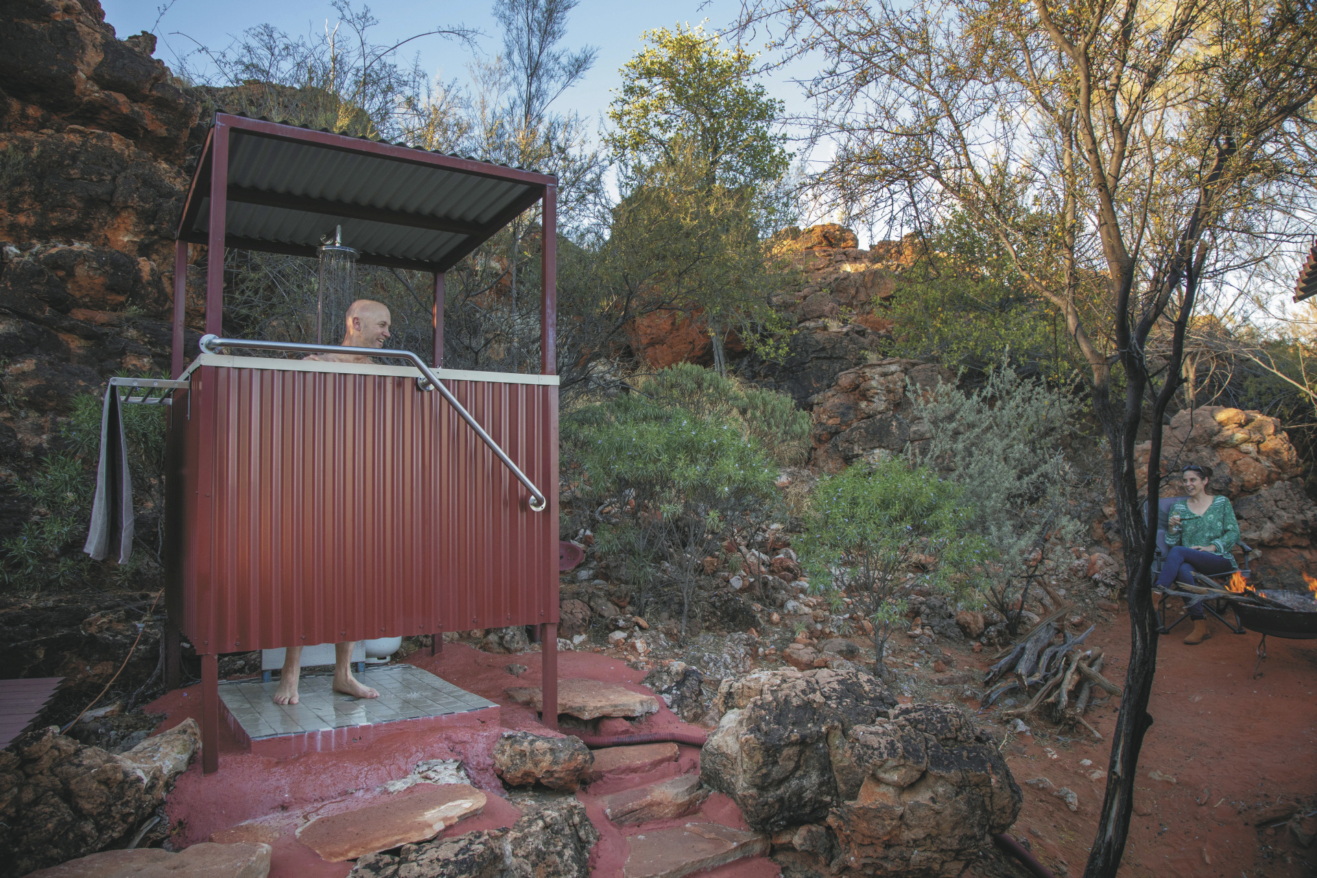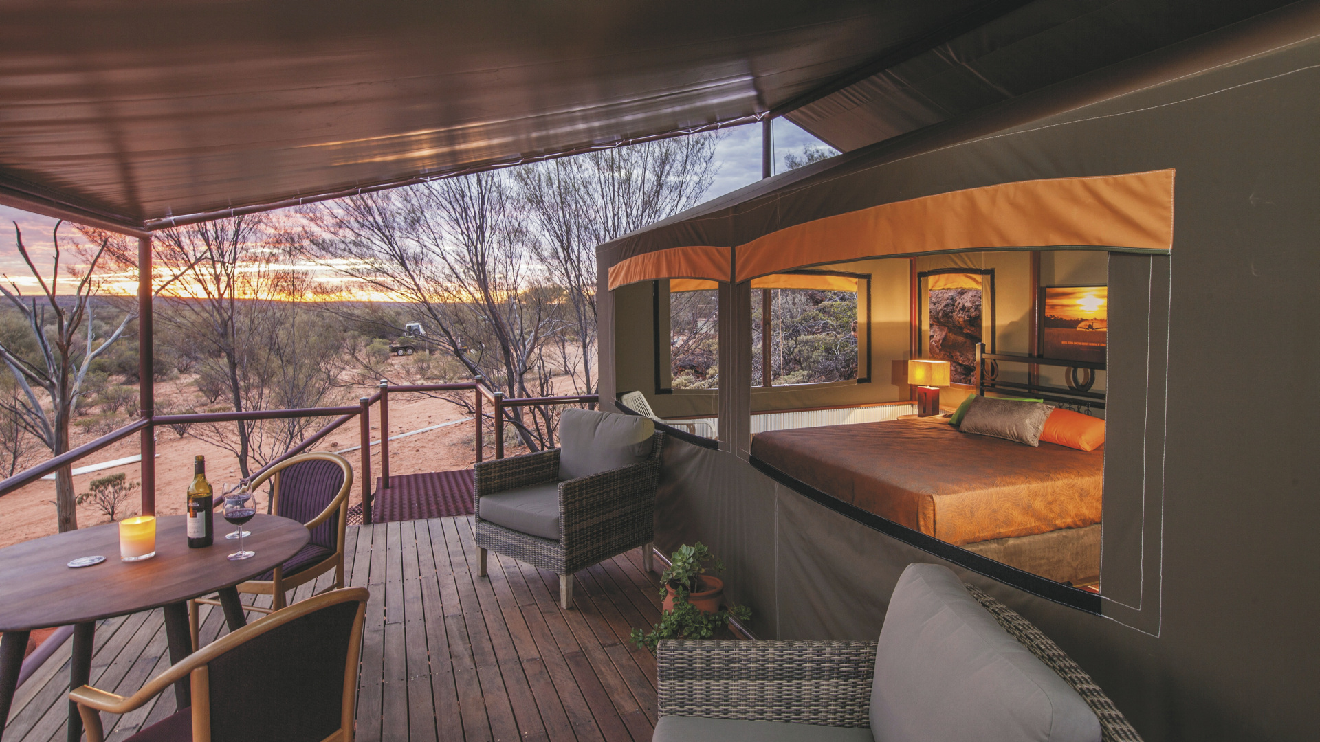 Die Anlage bietet verschiedene Unterkunftsoptionen, darunter die höherwertigen Kategorien Drovers Dream und Dreamtime Escarpment. Drovers Dream umfasst 10 Bungalow-Zelte in ruhiger Lage mit Blick auf die umliegende Landschaft. Zur Ausstattung zählen u.a. eigenes Bad mit Dusche, Queensize-Bett, Klimaanlage sowie eine private Terrasse mit BBQ. Weiterhin gibt es eine gemeinsame Feuerstelle.Die 3 größeren und komfortabler ausgestatteten Dreamtime Escarpment-Zelte liegen erhöht entlang eines Felsrands in abgeschiedener Lage (ca. 7 km von der Rezeption und dem Cafe entfernt; 4WD-Fahrzeug empfohlen) und bieten mehr Privatsphäre, weite Ausblicke sowie gute Luftzirkulation. Sie verfügen u.a. über ein Outdoor-Bad mit Dusche und WC, Kingsize-Bett mit hochwertiger Bettwäsche, Bademäntel und Slipper, Klimaanlage, Heizung, Stromanschluss und Kaffeezubereiter. Ergänzt wird die Ausstattung durch eine private Außenfläche mit Sitzmöglichkeiten und Feuerstelle. Gäste erhalten zusätzlich ein Verpflegungspaket mit BBQ-Dinner und Frühstück zur Selbstzubereitung. Ein Pool exklusive für die maximal 6 Gäste der Dreamtime Escarpment-Zelte steht ebenfalls zur Verfügung.
