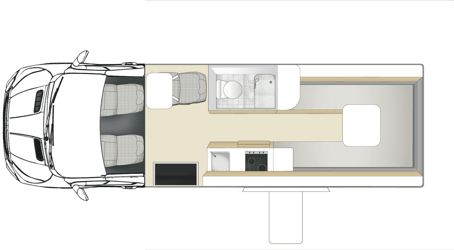 Der beliebte Euro Tourer verfügt über Dusche und Toilette und ein extra großes Bett. Geeignet für max. 2 Personen.