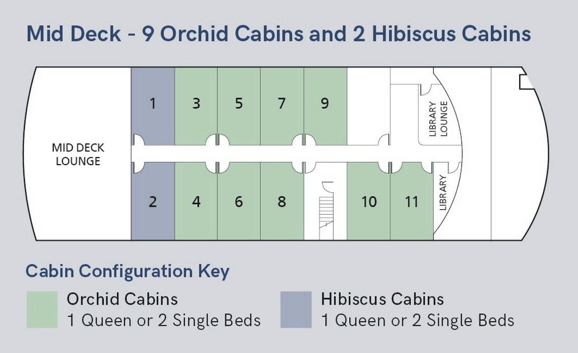 Mitteldeck: 9 Orchid-Kabinen, 2 Hibiskus-Kabinen, Lounge im hinteren Bereich, Bibliothek im vorderen Bereich